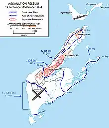Durant la bataille de Peleliu du 15 septembre 1944, 11 000 Japonais défendirent l'île quand la 1re division des Marines prit d'assaut l'île depuis son extrémité sud-ouest, juste à l'ouest de l'aérodrome. Le lendemain, le 5e régiment de Marines se déplaça afin de prendre l'aérodrome et capturer la côte est. Le régiment parcouru rapidement l'aérodrome sous les projectiles d'artillerie lourde positionnée dans les hautes terres plus au nord, ce qui entraîna de lourdes pertes. Après avoir pris l'aérodrome, ils avancèrent vers l'est de Peleliu, laissant les défenses japonaises du sud de l'île au 7e régiment de Marines. La zone fut fortement défendue par les Japonais, qui occupaient encore certaines poches. La température s'élevait à 46 °C ce qui entraîna de nombreuses pertes due à la chaleur du côté des Marines et la seule source d'eau disponible pour les forces américaines avait été contaminée par du pétrole. Finalement, huit jours après leurs débarquements, les 5e et 7e régiments de Marines atteignirent leurs objectifs en sécurisant la portion sud de l'île et l'aérodrome.