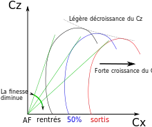 La polaire d'Eiffel représente la portance en fonction de la traînée. Lors de la sortie des aérofreins, la traînée augmente fortement. La courbe subit donc une unique translation vers la droite. Sur certains modèles, cette forte augmentation de traînée est accompagnée par une légère diminution de portance.