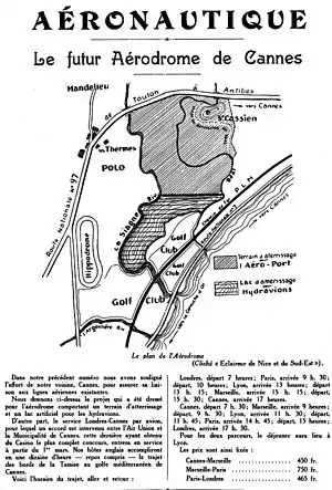 Le 1er octobre 1930 le Conseil général des Alpes-Maritimes réclame également la création d'un aéroport à Cannes conformément à l'avis du ministère de l'Air.