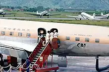 Un quadrimoteur Douglas DC-6 de la Civil Air Transport sur l'aéroport de Taipei Songshan en 1966.