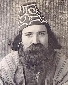 - Pendant qu'ils boivent lors d'une cérémonie, les hommes relèvent leur moustache avec un instrument en bois de saule[Note 3].
