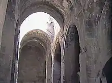 Des arcades, sur les côtés de la cour intérieure, ainsi que des pièces fermées abritaient des écuries, des offices et des logements. Une vaste partie couverte, de forme rectangulaire, se trouve sur le côté, à l'Ouest, et non dans l'axe de l'entrée, ce qui est inhabituel. Une petite tour s'élève au centre de la voûte. Elle est surmontée d'un petit dôme, qui comporte des ouvertures laissant pénétrer l'air et la lumière.