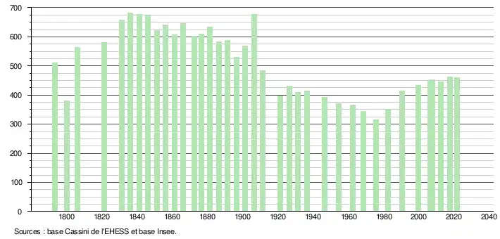 L'évolution du nombre d'habitants est connue à travers les recensements de la population effectués dans la commune depuis 1793. Pour les communes de moins de 10 000 habitants, une enquête de recensement portant sur toute la population est réalisée tous les cinq ans, les populations légales des années intermédiaires étant quant à elles estimées par interpolation ou extrapolation[22]. Pour la commune, le premier recensement exhaustif entrant dans le cadre du nouveau dispositif a été réalisé en 2007[23].