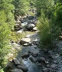 - le ruisseau de Buja ou de Trefontane[3] ou ruisseau de Trejontane[10] en partie haute (rg) 4,9 km[10] sur les deux communes d'Isolaccio-di-Fiumorbo et San-Gavino-di-Fiumorbo, avec les cascades de Bughjia, site de canyonning réputé[11] avec quatre ruisseaux affluents :