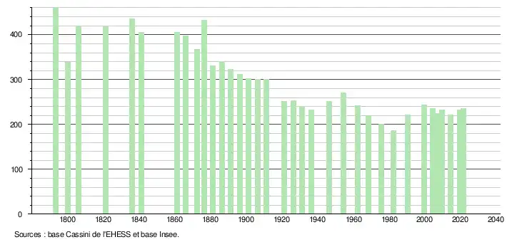 L'évolution du nombre d'habitants est connue à travers les recensements de la population effectués dans la commune depuis 1793. Pour les communes de moins de 10 000 habitants, une enquête de recensement portant sur toute la population est réalisée tous les cinq ans, les populations légales des années intermédiaires étant quant à elles estimées par interpolation ou extrapolation[20]. Pour la commune, le premier recensement exhaustif entrant dans le cadre du nouveau dispositif a été réalisé en 2004[21].