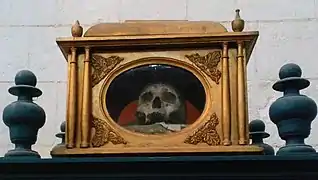 - Deuxième tableau: ...trois morts en décomposition qui s'avancent vers un calvaire représentant une Vierge à l'enfant. Ils tiennent à la main, une flèche ailée, une pioche et une pelle.