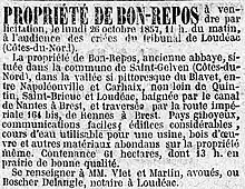 L'histoire de Bon-Repos est marquée par de nombreuses périodes de crises et d'opulence auxquelles la Révolution met un terme. En 1789, les 4 derniers moines de l'abbaye de Bon Repos fuient vers l'Angleterre et laissent le site à l’abandon. Cette date marque la fin de la vie monastique au sein de cette dernière. En 1791, un inventaire est réalisé dans l'abbaye par les révolutionnaires, puis elle est vendue comme bien national (son mobilier est dispersé et son orfèvrerie est envoyée à la fonte à l'hôtel des Monnaies de Nantes et de Paris)[13], et achetée d'abord par Jean-Baptiste Turquetit, un architecte de Pontivy, qui la revend rapidement à un tisserand révolutionnaire, Julien Le Bris[Note 9], maître tisserand de Rostrenen, qui y installe une manufacture de textile. Ce n'est qu'en 1796 qu'elle sera pillée - et non brûlée - par les chouans qui l'occuperont à plusieurs reprises comme caserne (elle sert un moment de quartier général à l'état-major de la 8e légion de l'Armée catholique et royale de Bretagne) ou comme refuge exceptionnel, par exemple à Pierre Guillemot en mai 1800. Elle subit aussi un pillage de la part de soldats de la Révolution : « En janvier [1794] (...) quatre hommes de la division du Cheyla envahissent l'Abbaye de Bon-Repos, dont le propriétaire, pour son bonheur, est absent, démolissent son mobilier et emportent sur plusieurs charettes un butin de toiles et de linge »[14].