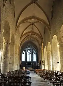 Les arcades en plein cintre ont une hauteur de 6,90 m dont les piliers sont alternativement ronds, octogonaux ou carrés sans bases ni chapiteaux, ceux qui sont ronds ont la particularité de posséder, dans leur partie haute, un anneau saillant qui supporte la corbeille à angles chanfreinés sur laquelle reposent les cintres. La nef avait à l'origine une charpente apparente qui reposait sur la corniche intérieure et au-dessus de chaque arcade se trouvait une fenêtre cintrée à 8 m du sol.