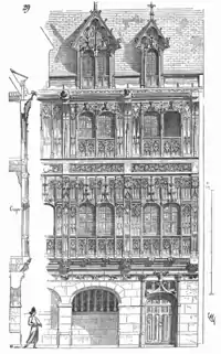 Façade de bois sculpté et tourelle du logis des abbesses de l'abbaye Saint-Amand à Rouen. Façade détruite en partie lors de la Seconde Guerre mondiale. La tourelle subsiste dans une propriété privée. | ||||