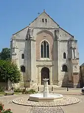 Abbatiale, vue depuis la place du village. | |