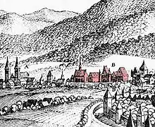 Abbaye impériale Saint-Maximin, gravure, vers le XVIIe siècle. | |||