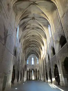 Son accès s'effectue, depuis le cloître, par un portail flanqué de grandes fenêtres doubles de chaque côté, le tout supporté par des colonnettes et des chapiteaux de différents types : feuille d'acanthe, feuille plate, feuille d'eau. Certaines de ces colonnes sont en marbre et proviennent sans doute d'une villa romaine préexistante. De beaux vases du cardinal de Bonzi ont été placés entre les baies. Une nef unique, sans piliers, supporte la voûte surbaissée en anse de panier. À l'est, sur le mur du fond, s'ouvre une fenêtre à trois ouvertures ("triplet cistercien" en souvenir de la trinité). Des fragments du jubé mutilé lors des guerres de Religion, aujourd'hui réinstallés sur les bancs, avaient été utilisés par les moines pour bâtir l'escalier menant à la Porte des Matines. On peut encore admirer certaines scènes : "Les Saintes Femmes au Tombeau", "Mise en croix", "Annonciation", "Baptême du Christ", "Déposition", "Arrivée du Christ à Jérusalem", "Jésus parmi les Docteurs".