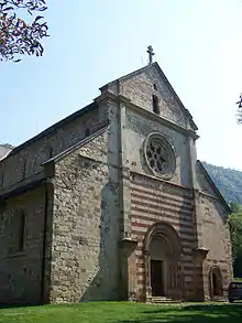 L'abbatiale actuelle est construite assez tardivement, aux XIVe et XVe siècles, en remplacement d'un édifice en style roman tardif, et est de style gothique[4].