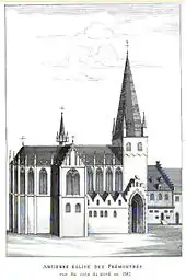 Léonard De Limbourg est élu le . Il jette les fondements de la nouvelle église de l'abbaye, mais son décès le ne lui permit pas de l'achever. Elle est continuée par ses successeurs. C'était, d'après Langius et Pierre Lambert de Saumery[6], une petite église gothique qui se distinguait par ses belles proportions et ses riches décorations.
