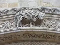 De chaque côté de l’archivolte supérieur, les vieillards de l’apocalypse de saint Jean dansent et jouent du vièle, les 24 rosettes symbolisent leur nombre exact, l’agneau de l’apocalypse couronne la composition.