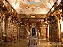 La bibliothèque (Stiftsbibliothek Melk (de)) existe depuis la fondation de l'abbaye. La fresque du plafond, peinte par Paul Troger (1731-32), représente une allégorie de la Foi, elle est le pendant thématique de la salle de marbre qui met en scène la Sagesse humaine. Autour du personnage central (une femme soutenant dans une main le Livre aux Sept Sceaux et l'Agneau de l'Apocalypse, et s'appuyant de l'autre sur un écu au motif de l'Esprit Saint sous forme de colombe), évoluent des groupes distincts représentant les quatre vertus cardinales : la sagesse, l'équité, la force et la tempérance. Les statues en bois doré, placées aux entrées, symbolisent les quatre facultés : le droit, la médecine, la philosophie et la théologie. Le globe terrestre et la sphère céleste sont de Vincenzo Coronelli (1670).