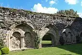 Le mur du cloître conservé est composé de sept arcatures, de l'église au logis abbatial : deux cintres jumeaux du XIIe siècle avec des ouvertures donnant sur la sacristie, trois grandes arcatures ogivales de l'époque de l'abbé Jean Eschard, la sixième arcature est l'ancienne porte du réfectoire et la septième arcature ou cintre Tudor conduit dans la salle commune et remonte aussi à l'abbé Jean Eschard.