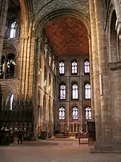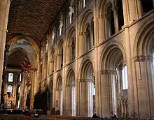 La chapelle de la Vierge au nord de l'église, aujourd'hui détruite, est commencée en 1272 et son autel consacré en 1290. Au XIVe siècle, le haut de la tour centrale romane est démoli, certainement par crainte d'un éboulement comme à la cathédrale d'Ely et remplacé au-dessus des arcades romanes par une lanterne plus légère. Les fenêtres romanes sont transformées en ouvertures de style gothique perpendiculaire[5].