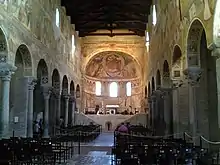 L'intérieur de l'église a trois nefs, divisées par des colonnes romaines et byzantines. Le sol en marbre précieux, disposé en opus sectile, date de diverses époques, du VIe au XIIe siècle et représente des animaux monstrueux, des motifs géométriques, des éléments végétaux et figuratifs. Parmi les allégories, le lion symbolise la résurrection du Christ, le dragon le mal toujours vaincu, le cerf est le Christ, les oiseaux avec des ailes au repos représentent la condition humaine[6]. Sur les murs, sont peintes des fresques du XIVe siècle de l'école bolognaise représentant des histoires de l'Ancien Testament, du Nouveau Testament et de l'Apocalypse de Jean exécutées respectivement sur les parties supérieure, moyenne et inférieure. En plus de Saint-Jean dans l'extase de Patmos, parmi les images de l'Apocalypse, sont représentés : l'Agneau sur un chapiteau, dans un clipeus peint avec les pattes posées sur le livre des sceaux ; les quatre chérubins connus comme les représentations du tétramorphe (Livre d'Ézéchiel 1, 10; Apocalypse 4, 6-8) ; les quatre chevaliers aux couleurs blanc, rouge, noir, vert avec autant d'attributs symboliques : couronne, épée, écailles, enfer. Parmi les autres scènes, on trouve : Dieu avec le livre des sept sceaux ; les vingt-quatre anciens ; l'archange Michel se battant contre le diable ; la bête à sept têtes ; l'hydre qui menace l'Église représentée comme une figure féminine confiante puisqu'elle domine le temps, c'est-à-dire la lune placée à ses pieds (Révélation de Jean 12, 1-4), la charge de la cavalerie sulfureuse, la femme-Ecclesia (Église) avec un léger gonflement du ventre parce qu'elle est enceinte, le diable chauve-souris, Jean qui se retire pour méditer dans le temple (fresque sud), l'Agneau sur le mont Sion avec les cent cinquante mille rachetés en sa présence, etc.