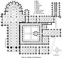 Le plan de l'ensemble est celle d'une abbaye cistercienne traditionnelle du XIIe siècle remontant à Bernard de Clairvaux, avec des dimensions toutefois plus généreuses en raison du nombre important de moines qui devaient y être installés. Comme particularité, Royaumont disposait d'un pavillon abbatial accolé perpendiculairement au bâtiment des convers et couvert d'ardoises[47]. Avec cette exception, le plan de l'abbaye de Royaumont est superposable à celui de l'abbaye de Longpont, qui date effectivement du XIIe siècle, exception faite de l'abbatiale achevée seulement en 1226. Louis IX ayant assisté à sa consécration le , l'on peut être certain qu'il demanda de relever les mesures sur place. Selon Henri-Louis Duclos (1867), l'architecte fut Pierre de Montreuil[a 28] ; selon Alain Erlande-Brandeburg (2004), l'architecte reste anonyme[48]. L'auteur, qui indique pourtant Henri-Louis Duclos comme référence, n'explique pas pourquoi il doute de l'intervention de Pierre de Montreuil[49].
