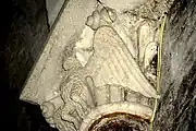 Le chapiteau est très abîmé, mais mérite attention en raison de la qualité des reliefs qui ont survécu au vandalisme.