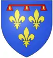 Les armoiries de l'abbaye de Saint-Pierre-sur-Dives : D'azur à trois fleurs de lys, 2 et 1, et un lambel de trois pendants, de gueules, en chef, chaque pendant chargé d'une tour d'or[17].