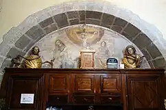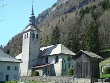Le chœur de l'église médiévale comprend quatre travées surmontées de voûtes d'ogives de tuf qui reposent sur des culots sculptés de figures humaines. L'église est éclairée par un triplet dans le chevet et deux grandes baies modernes dans le mur gouttereau sud. Au niveau de la troisième travée orientale, deux chapelles donnent l'illusion d'un transept. La chapelle nord est construite sur un rocher de calcaire qui a été détaché de la montagne[23]. La nef moderne comprend trois travées et une tribune. La sacristie était elle aussi couverte de voûtes d'ogives de calcaire de Sixt. C'est là que se trouve la peinture de la Crucifixion.
