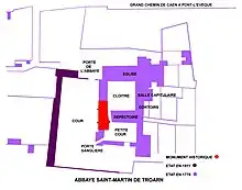 Au sud du grand chemin de Caen à Pont-l'Évêque, on accède à la grande porte d'entrée par une grande place d'où l'on descend à l'église. De la grande porte on entre dans la cour commune avec le logement du portier, les écuries, l'aumônerie, la grange et le pressoir, les maisons du prieur et des abbés. La porte sanglière donne sur la petite cour avec le chartrier et l'infirmerie.