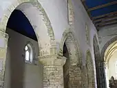 Les sept chapiteaux sculptés romans subsistant sont majoritairement ornés de motifs végétaux de belle facture et surmontés d’un tailloir parfois décoré. Un seul chapiteau présente un motif géométrique, deux rangées de dents de scie séparées par un cordon[41].