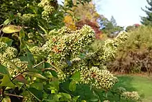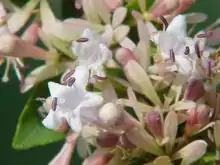 L'inflorescence est une grande panicule terminale de fleurs appariées (fleurs s'ouvrant consécutivement). Les fleurs sont odorantes, avec six bractées oblongues ou lancéolées à la base des ovaires appariés. Le calice a cinq sépales, elliptique, de 5–6 mm, devenant rouge au stade de la fructification. La corolle est pentalobée, blanche à rose, en forme d'entonnoir, de 10–12 mm, environ deux fois plus longue que les sépales, pubescente à l'extérieur et gibbeuse à la base du tube. Les étamines et le style sont longs exsérés ; les filaments sont minces, de longueur égale, insérés à la base du tube de la corolle. L'ovaire est cylindrique, légèrement comprimé, pubescent, strié longitudinalement ; les stigmates sont capitonnés. L'achène est couronné de sépales persistants et légèrement élargis. La diploïdie est de 2n=32[3].