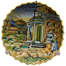 faïence du XVIe siècle représentant Abimelech épiant Isaac et Rébecca.