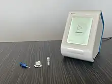 Le principe du test repose sur le mélange de l’échantillon du patient (sang total, capillaire, sérum, salive ou échantillon nasopharyngé) à un réactif contenant des marqueurs fluorescents[2]. La solution est alors déposée sur la capsule et entre par capillarité dans les chambres nanométriques. Le ratio volume-surface force alors l’interaction immédiate des molécules limitant leur trajet et réduisant le temps d’incubation à quelques minutes. La concentration de la molécule d’intérêt est alors proportionnelle à la mesure de l’intensité du signal fluorescent par l’abioSCOPE.