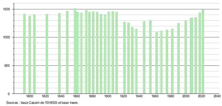 L'évolution du nombre d'habitants est connue à travers les recensements de la population effectués dans la commune depuis 1793. Pour les communes de moins de 10 000 habitants, une enquête de recensement portant sur toute la population est réalisée tous les cinq ans, les populations légales des années intermédiaires étant quant à elles estimées par interpolation ou extrapolation[24]. Pour la commune, le premier recensement exhaustif entrant dans le cadre du nouveau dispositif a été réalisé en 2007[25].