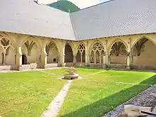 - Cloître gothique du XIVe siècle présentant un ensemble de peintures murales figurant le cycle Marial, parmi celles-ci l'annonciation, la nativité, la fuite en Égypte ou les noces de Cana. Ces peintures datent vraisemblablement de la première moitié du XVe siècle et illustrent l'art de cour mais aussi par de nombreux détails l'environnement local. L'iconographie s'inscrit dans un style gothique tardif piémontais rappelant l'école florentine. On a évoqué à leur sujet Giacomo Jaquerio, maître turinois.