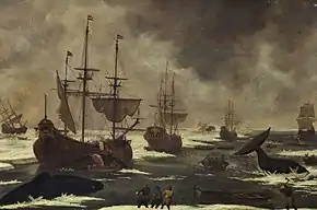 Abraham Matthijs peint les Baleiniers dans la glace ( National Maritime Museum Greenwich, Londres)[5]. Il représente une flotte de navires baleiniers au travail, avec certaines baleines qui se débattent pendant qu'on les tire vers le rivage[6].