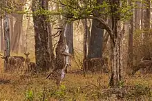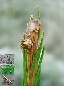 L'abroutissement (prélèvement et consommation des bourgeons, des jeunes pousses vertes et tendres et des rameaux lignifiés) fait partie des principaux dégâts sur les arbres avec le frottis (de frayure et de rut), l’écorçage (consommation d’écorce par les cervidés)[5] et le rongement d’écorce (morsures par les lièvres et les lapins)[6].