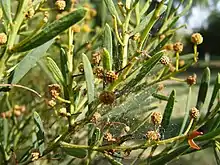 Cet arbrisseau touffu est généralement haut de 1 à 3 mètres. Il fleurit de septembre à février ; ses fleurs sont jaunes[2]. Ses branches sont dressées, rigides, glabres et poussent vers l'extérieur, formant un buisson d'un diamètre de 1 à 3 mètres[1]. Ses phyllodes sont épais et rigides, de forme linéaire à obovale. Ils atteignent une longueur d'environ 5 cm et une largeur de 3,5 cm.