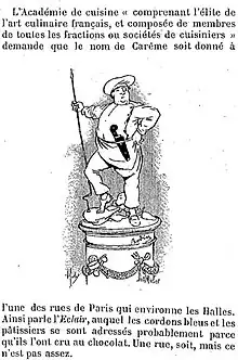 - Le Constitutionnel, 31 janvier 1885 (Article anonyme: Examen à l'Académie de cuisine). Ce texte met en lumière le souci diététique et hygiéniste de l'Académie, proche des milieux médicaux[58] ainsi que l'ambiance conservatrice du projet.