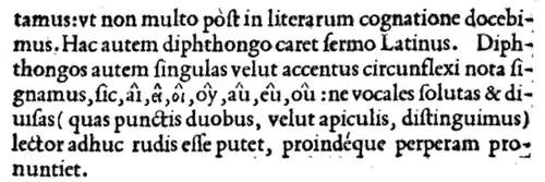 - Nanque [sic] aî Græcis propriam, Latinis quibuſdam poetis vſurpatam, non æ, ſeu ε cum Græcis : non aï diuiſas vocales cum poetis Latinis, ſed aî vna ſyllaba vtriuſque vocalis ſonum leniter exprimente, pronuntiamus [...].