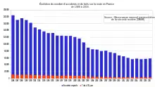 Le pic de la mortalité routière est atteint en 1972 avec 18 034 morts. Cela représente un taux de mortalité 12 fois plus élevé qu'en 2021 avec 2 944 morts (six fois plus de morts, deux fois moins de voitures[réf. nécessaire]). Cela représentait presque 50 décès par jour, 0,716 tué pour 1 000 véhicules, le tiers des personnes décédées étant les piétons, cyclistes et motocyclistes[26] et 386 874 blessés[27].