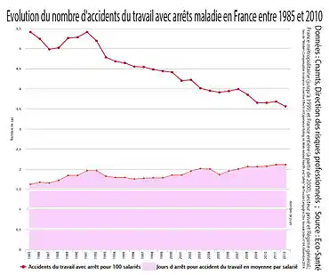 En raison notamment d'une désindustrialisation et d'une diminution de la dangerosité de nombreux appareils, le nombre d’accidents du travail avec arrêt (et leur fréquence par rapport au nombre d’heures rémunérées) sont en régulière diminution dans les pays industrialisés, dont en France, et notamment de 2005 à 2010 note la DARES, notamment dans les secteurs concurrentiels, en raison d'un ralentissement de l'activité économique avec toutefois un minimum en 2009 suivi d'un plateau de 2009 à 2010[32] puis d'une nouvelle « amélioration » de la courbe. Le nombre de jours d'arrêt de travail par accident est en augmentation légère, mais régulière[33]. Le risque est plus élevé pour les ouvriers, jeune et de sexe masculin. Ce risque n'a pas diminué pour les femmes[32].