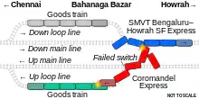 - Le Coromandel Express se dirige vers Chennai sur une ligne en direction du sud à une vitesse de 128 km / h. Il reçoit le signal de continuer sur la ligne principale sur laquelle il arrivait. Cependant, pour des raisons inconnues, le signal a ensuite été retiré pour la ligne principale et l’itinéraire a été commuté vers une ligne en boucle adjacente à la ligne principale[5] ;