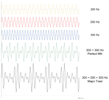Les trois notes d'un accord parfait majeur correspondent (plus ou moins exactement selon le tempérament utilisé), aux trois harmoniques de rangs 4, 5 et 6 d'une fonction périodique dont la fréquence est située 2 octaves en dessous de la fondamentale du dit accord.