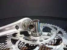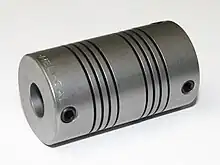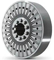 C'est une forme d'accouplement sans clavette[2] qui ne nécessite pas non plus d'usiner l'un des arbres. L'idée de base est analogue au coupleur à clavette, mais le moment cinétique est transmis très près de l'axe de l'arbre[3] : il s'agit de fixer le coupleur par une bague de serrage munie de boulons[4],[5],[6]. Ce dispositif réalise un autocentrage sur chaque arbre et sa maintenance ne requiert qu'une clef ; le prix, évidemment, n'est pas le même.