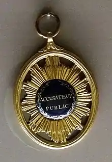 Le 29 septembre 1791, l’Assemblée décide que « les accusateurs publics auront le même costume que les juges, à l’exception des plumes, qui seront couchées autour de leur chapeau ; ils porteront sur leur médaille ces mots : « la sûreté publique[3]. Les accusateurs publics récupèrent également une fonction administrative de surveillance des officiers de police judiciaire, des juges de paix et des officiers de gendarmerie[3].