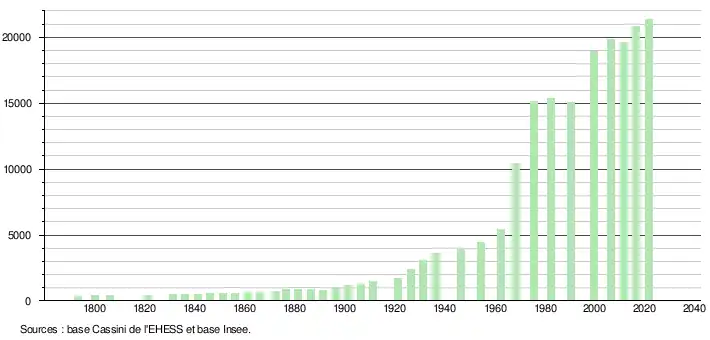 - Par convention dans Wikipédia, le principe a été retenu de n’afficher dans le tableau des recensements et le graphique, pour les populations légales postérieures à 1999, que les populations correspondant à une enquête exhaustive de recensement pour les communes de moins de 10 000 habitants, et que les populations des années 2006, 2011, 2016, etc. pour les communes de plus de 10 000 habitants, ainsi que la dernière population légale publiée par l’Insee pour l'ensemble des communes.