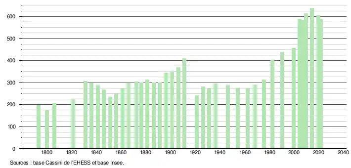 L'évolution du nombre d'habitants est connue à travers les recensements de la population effectués dans la commune depuis 1793. Pour les communes de moins de 10 000 habitants, une enquête de recensement portant sur toute la population est réalisée tous les cinq ans, les populations légales des années intermédiaires étant quant à elles estimées par interpolation ou extrapolation[26]. Pour la commune, le premier recensement exhaustif entrant dans le cadre du nouveau dispositif a été réalisé en 2004[27].