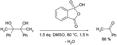 L'acide 2-iodoxobenzoïque est connu aussi pour oxyder les diols vicinaux comme des glycols en dicétones et sans couper la liaison carbone-carbone entre les deux fonctions alcool[11]. Cependant, un clivage oxydatif peut se produire lorsque des conditions plus dures sont utilisées (température plus élevée ou de l'acide trifluoroacétique comme solvant)[12] :