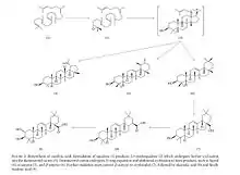 L'acide oléanolique appartient à un grand groupe de produits naturels à structure diverse qui comprend des stérols, des stéroïdes et des saponines triterpénoïdes. Une voie proposée pour la biosynthèse de l'acide oléanolique, part du farnésyl-pyrophosphate dérivé de la voie de mévalonate. À partir du farnésyl-pyrophosphate, le squalène est formé par la squalène synthétase. Le squalène subit une réaction oxydante conduisant au 2,3-Oxydosqualène. Ensuite, le 2,3-Oxydosqualène est cyclisé en beta-amyrine du triterpénoïde du type oléanane pentacyclique par la Bêta-Amyrine synthase. Enfin, la beta-amyrine est oxydée dans une séquence d'oxydation en trois étapes par CYP716A[7] pour donner de l'acide oléanolique à travers l'érythrodiol[8].