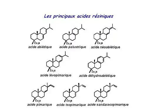 La résine contient en général un mélange d’acides résiniques dont la nature et les proportions varient suivant l’espèce et la provenance géographique. Les acides résiniques sont présents dans la résine de pin sous la forme d’isomères d’acides carboxyliques diterpéniques de formule générale C20H30O2 (masse moléculaire : 302 g/mol). Leur structure dérive du couplage d’unité isoprène qui forme les mono, sesqui, di et triterpènes.
